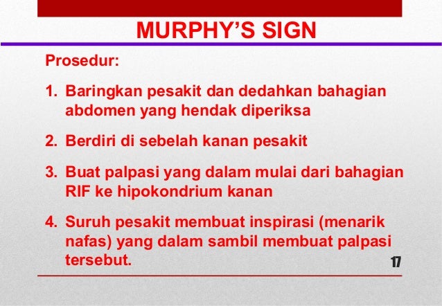 Murphy s Sign pada cholecystitis acuta yaitu tangan diletakkan di abdomen pada garis midklavikularis Pasien bernapas dalam dan tangan kanan naik ke atas suatu saat napas pasien terhenti berarti Murphy s Sign positif Palpasi Tumor Palpasi tumor dinding perut intraperitoneal atau retroperitoneal caranya